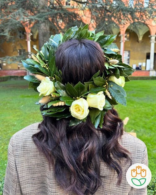 Le coroncine sono realizzate con alloro fresco e possono essere richieste in versione classica oppure personalizzate con bacche e rose. La scelta della finitura consente di adattare la corona allo stile del laureando, mantenendo un profilo sobrio e istituzionale. Lavorazioni e proporzioni sono curate per garantire equilibrio e comfort di indosso durante foto, proclamazioni e festeggiamenti.